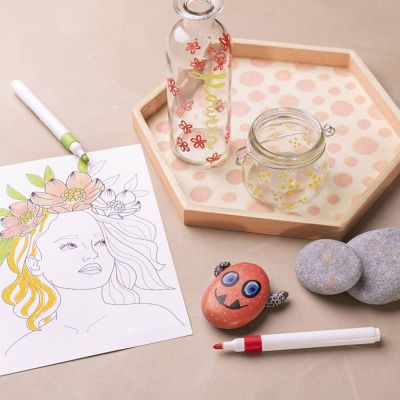 Met deze set acrylstiften op waterbasis kun je op bijna elke ondergrond tekenen, bijvoorbeeld steen, papier, canvas, glas, porselein, plastiek, hout, karton en metaal. De verf is niet permanent, dus je kunt het gemakkelijk van materialen verwijderen met water en zeep. De verf is echter vrij waterbestendig als het droog is.