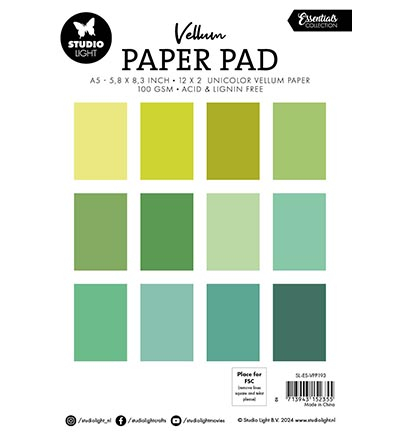 Sl-es-vpp193 Studio Light - Unicolor Vellum Paper Pad - Shades of Green - 100grams - Perkament - 12 kleuren - 24 vel - A5