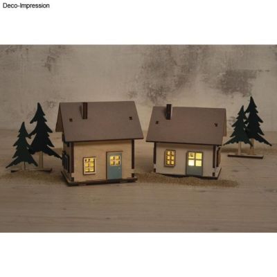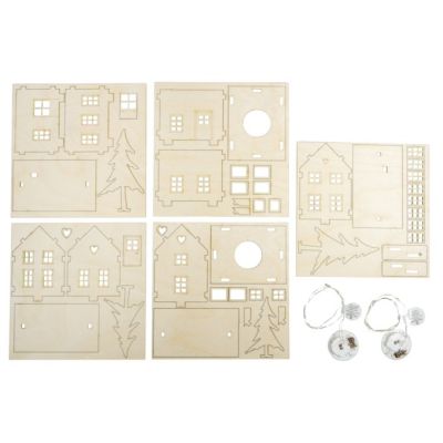 Dit houten bouwpakket met lichtgevende huisjes bestaat uit twee verschillende huisjes, vier dennenbomen en twee led-lampjes (batterijen niet inbegrepen).