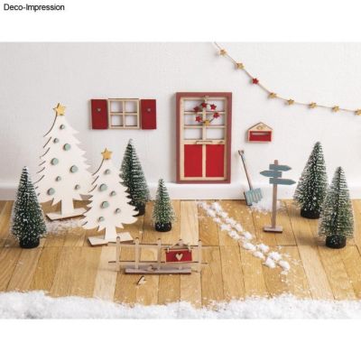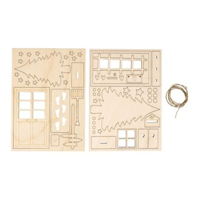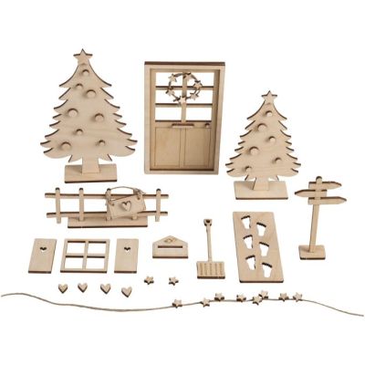 Haal de houten onderdelen los van de houten plaat, beschilder ze en lijm/versier ze, bijvoorbeeld in een lijst of op een houten plankje. De kerstbomen, wegwijzers en het hek hebben standaards en kunnen vrijstaand worden neergezet.