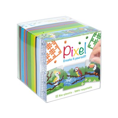 Deze pixel kubus Tropische Vogels van Pixelhobby bevat alle benodigdheden voor het maken van 3 verschillende afbeeldingen. Het setje is geschikt voor kinderen vanaf 6 jaar. Elk pixelwerkje bestaat uit 1 kleine basisplaat en wordt 6x6cm groot.