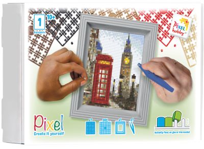 Pixel set London van Pixelhobby. In deze complete set is alles aanwezig, het patroon, pixelplaatjes, 1 basisplaat en een kunststof lijstje en pincet. Geschikt voor kinderen vanaf 8 jaar en ouder.