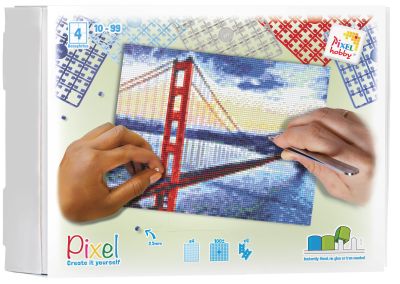 Pixel set Golden Gate Bridge van Pixelhobby. In deze complete set is alles aanwezig van patroon, pixelplaatjes en 4 basisplaten. Geschikt voor kinderen vanaf 10+.