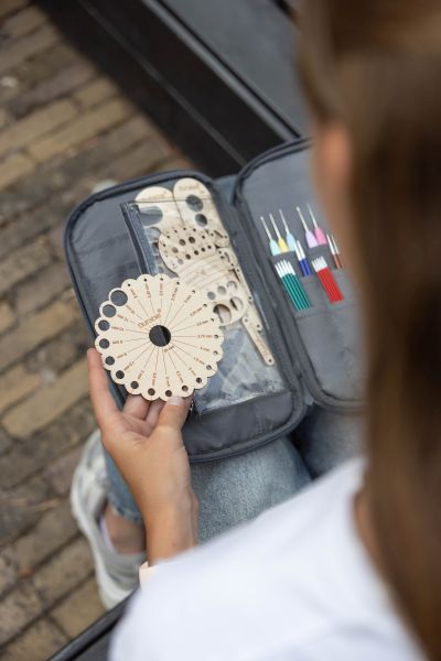 Dit etui biedt niet alleen een efficiënte opbergmogelijkheid, maar zorgt er ook voor dat al je naalden en accessoires op één plek blijven, veilig opgeborgen en altijd binnen handbereik. Perfect voor de handwerkster die graag goed georganiseerd is, of je nu thuis bent of onderweg.