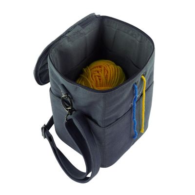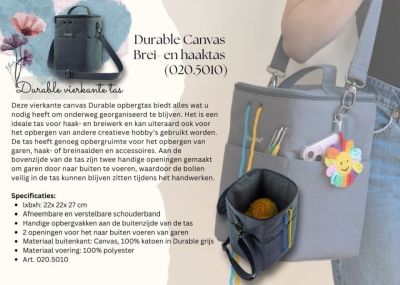 Deze vierkante canvas Durable opbergtas biedt alles wat je nodig hebt om onderweg georganiseerd te blijven. Het is een ideale tas voor haak- en breiwerk en kan uiteraard ook voor het opbergen van andere creatieve hobby's gebruikt worden. De tas heeft genoeg opbergruimte voor het opbergen van garen, haak- of breinaalden en accessoires. Aan de bovenzijde van de tas zijn twee handige openingen gemaakt om garen door naar buiten te voeren, waardoor de bollen veilig in de tas kunnen blijven zitten tijdens het handwerken.