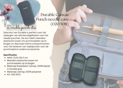 Deze etui van Durable is perfect voor het opbergen van alle benodigdheden voor het needle punchen. De etui heeft meerdere elastische lussen om punchnaalden op te bergen en daarnaast kleine compartimenten voor het bewaren van naaldpunten voor de punchnaald en andere accessoires.