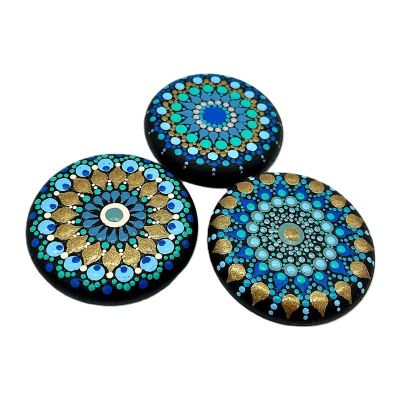 De toepassing is heel eenvoudig: De platte kant van elk stokje of het bolletje op de embossingpen wordt gedrenkt in vloeibare verf. Vervolgens wordt hiermee op het gewenste oppervlak gestipt, bijvoorbeeld hout, canvas of steen.