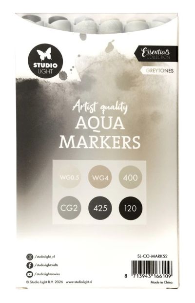 Sl-co-mark52 Studio light - Essentials Collection - Artist Quality Aqua Markers - Greytones - 2 tips - Fijne + Brede Penseelpunt - Set 6st
