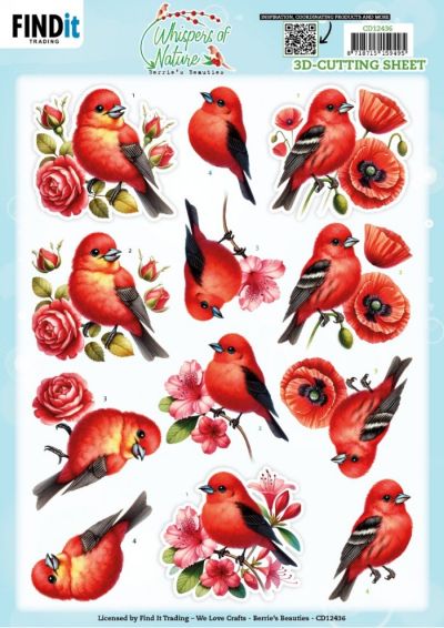CD12436 3D Knipvel - Berrie's Beauties - Whispers of Nature - Red - A4 - Vogels/Bloemen