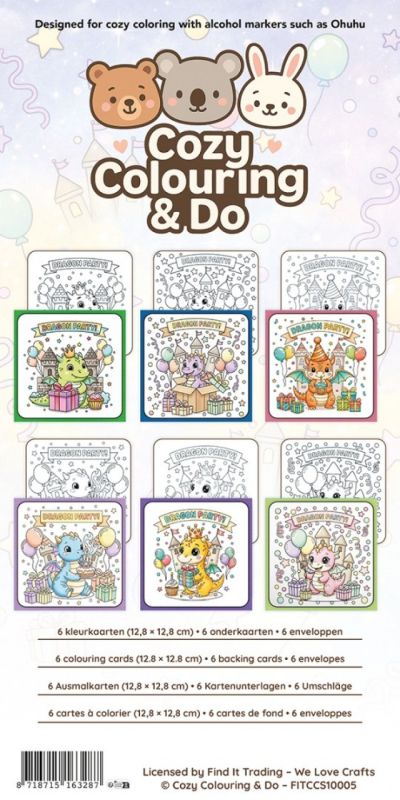 FITCCS10005 FindIt Color - Cozy Colouring and Do - Cards Set - Dragon Party - 6 kleurkaarten 128x128mm + onderkaarten + enveloppen - 135x270mm - Draakjes