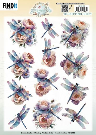 CD12444 3D Knipvel - Berrie's Beauties - Dragonflies - Azure - A4 - Libellen/Bloemen/Blauw