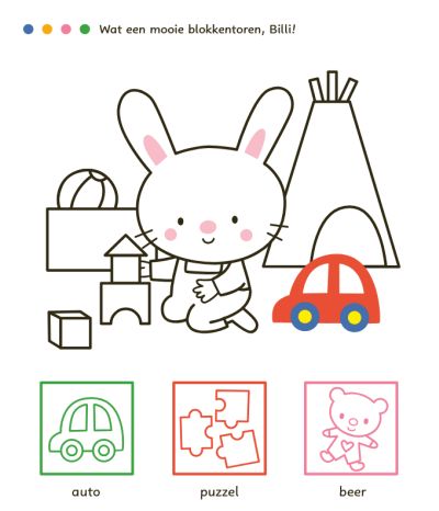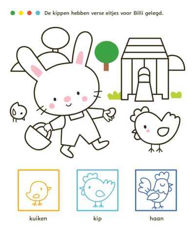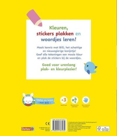 Maak kennis met Billi, het schattige en nieuwsgierige konijntje! Billi neemt je in dit leuke kleur- en stickerboek mee naar een heleboel leuke tekeningen die je met je potloden en stiften een mooie kleur mag geven. Bovendien zitten er leuke stickers bij die allemaal een plekje in dit boek moeten krijgen. Bij elke sticker staat het juiste woord zodat je al spelend je woordenschat verrijkt. Goed voor urenlang plak- en kleurplezier! Voor kinderen vanaf 3 jaar.