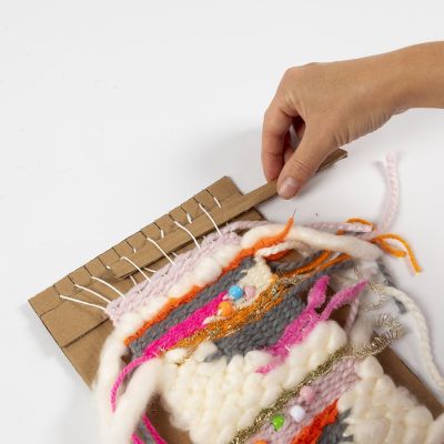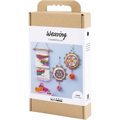 Wil je het plezier van weven ontdekken? Ontdek het met deze leuke en eenvoudige set. Hij wordt geleverd met een weefraam dat direct op de verpakking is geprint - klaar om te knippen en te monteren. Kies uit verschillende soorten garen om je eigen wandhanger te ontwerpen. Er zijn ook sjablonen voor twee kleine ronde wandhangers om rond te weven. Met het overgebleven garen maak je pompons met het handige pompongereedschap en voeg je extra decoraties toe aan je creaties.