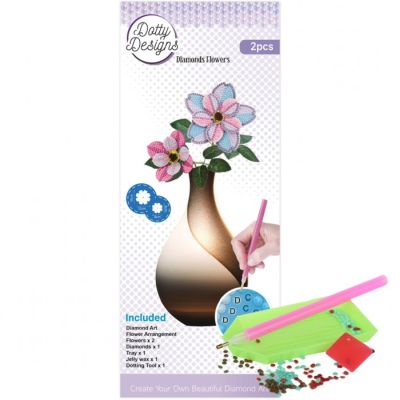 Dit setje Diamonds Flowers - Blue Gerbera Bouquet van Dotty Designs is een creatieve Diamond Art set waarmee twee decoratieve, realistische bloemen worden gemaakt. De diamantsteentjes worden één voor één met een pen op de aangegeven symbolen geplaatst. Na het aanbrengen worden de bloemonderdelen en accessoires gemonteerd tot een compleet bloemarrangement. De set is geschikt voor hobbygebruik en biedt een gestructureerde en rustgevende knutselactiviteit.