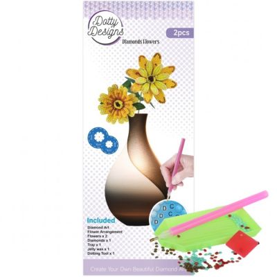 Dit setje Diamonds Flowers - Yellow Gerbera Bouquet van Dotty Designs is een creatieve Diamond Art set waarmee twee decoratieve, realistische bloemen worden gemaakt. De diamantsteentjes worden één voor één met een pen op de aangegeven symbolen geplaatst. Na het aanbrengen worden de bloemonderdelen en accessoires gemonteerd tot een compleet bloemarrangement. De set is geschikt voor hobbygebruik en biedt een gestructureerde en rustgevende knutselactiviteit.