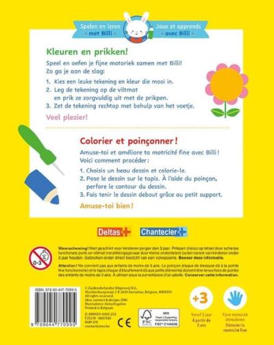 Met dit superleuke prikblok oefenen kinderen vanaf 3 jaar hun handvaardigheid op een speelse manier. Laat je kind een van de kleurplaten van Billi uitkiezen en inkleuren. Leg daarna de kleurplaat op de viltmat en gebruik de prikpen om gaatjes te prikken langs de stippellijnen. Duw ten slotte de tekening uit en zet deze rechtop met behulp van het voetje. Ideaal als voorbereiding op het leren schrijven! 9 kleurplaten met prikpen en viltmat.