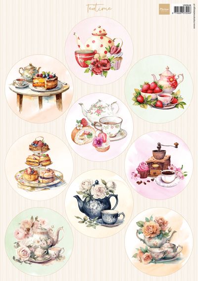 Maak in een handomdraai de gezelligste kaarten met het 'Teatime' cirkel-knipvel van Marianne Design! Dit vel staat vol met prachtige, ronde illustraties van theepotten, kopjes, cupcakes en bloemige theeserviezen in een sfeervolle, romantische stijl.